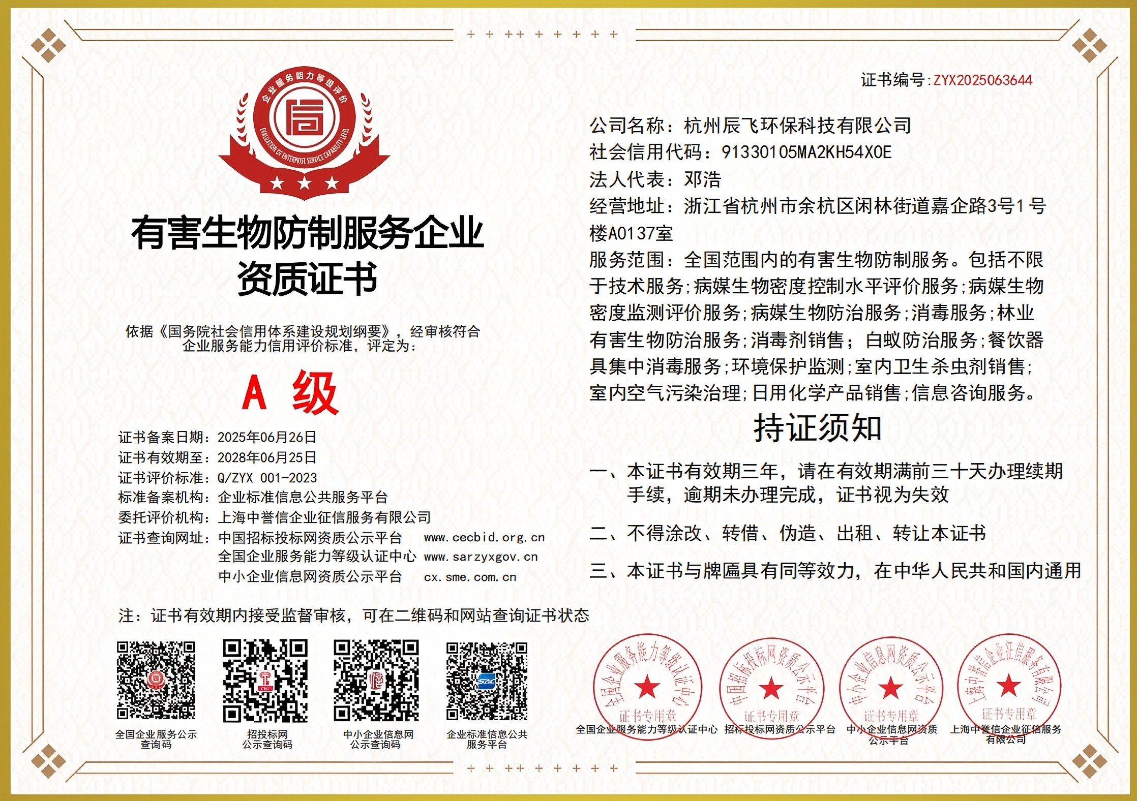 杭州辰飛環保科技有限公司是一家專業的PCO有害生物防治服務機構。是經杭州市工商局注冊登記、杭州市白蟻防治管理所、PCO協會批準的城市害蟲綜合治理消殺公司,是集除四害、白蟻消殺、除蟲、消毒殺菌、室內空氣污染治理、藥械銷售于一體的大型專業杭州有害生物防治科技有限公司。主要從事新建、擴建、改建、裝飾裝修單位建筑物的白蟻防治和白蟻預防工程,同時從事工廠、酒店、企事業單位、住宅小區和家庭的”四害”消殺和白蟻防治服務,長期向各類型客戶提供杭州白蟻消殺、除蟑螂、除老鼠、除蟲、消毒殺菌等優質服務。 本公司自成立以來,秉承“誠信、敬業、高效、務實”的發展原則,以現...